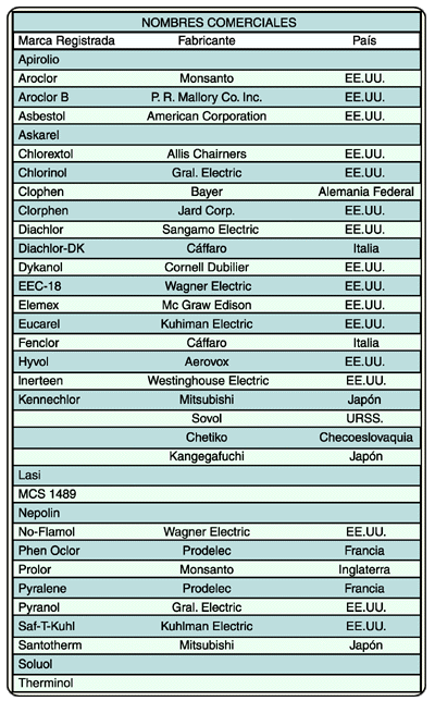 4. Introducción: Los hidrocarburos aromáticos clorados constituyen una amplia gama de compuestos químicos orgánicos, obtenidos a partir del agregado de átomos de Cl (entre 42 y 51%) a moléculas de difenilos de origen sintético. Entre ellos los "difenilos policlorados" (D.T.C.) y "trifenilos policlorados" (T.P.C.); también se los conoce por su denominación en idioma inglés "polichlorynated biphenyls" (PCBs) y "polichlorynated triphenyl" (PCTs), y son utilizados en las siguientes aplicaciones (enumeradas en orden a su mayor frecuencia): capacitores, componentes de resinas y gomas sintéticas, papel carbónico, en transformadores, rectificadores, fluido hidráulico, aceite de corte, líquido para transferencia de calor, pigmento para pinturas, selladores, adhesivos, tintas de imprenta, ceras. Cuando se lo emplea en equipos eléctricos se lo conoce bajo la denominación genérica de askarel (primera marca registrada), no obstante raramente las placas características de los equipos indican Askarel o D.P.C., siendo común indicar la marca registrada del fabricante, los más conocidos son los señalados en el Anexo III.